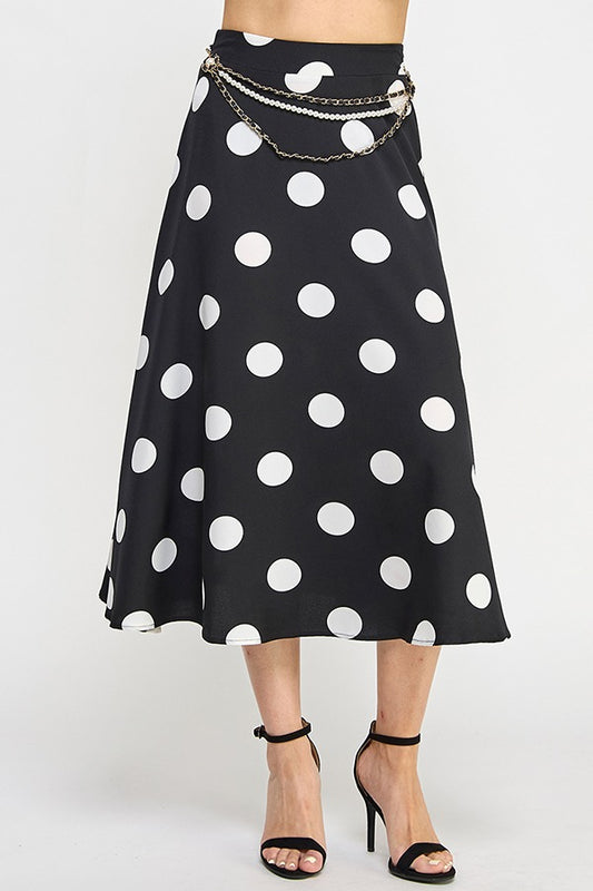 POLKA DOT PRINT PLEATED MIDI SKIRT W/BELT