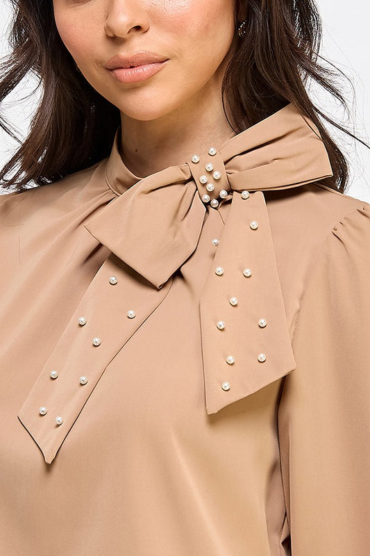 PEARL DETAIL BOW LSLV FITTED TOP | COLOR MOCHA