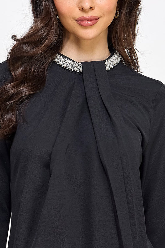 LSLV MOCK NECK TOP W/ TRIM DETAIL COLOR BK