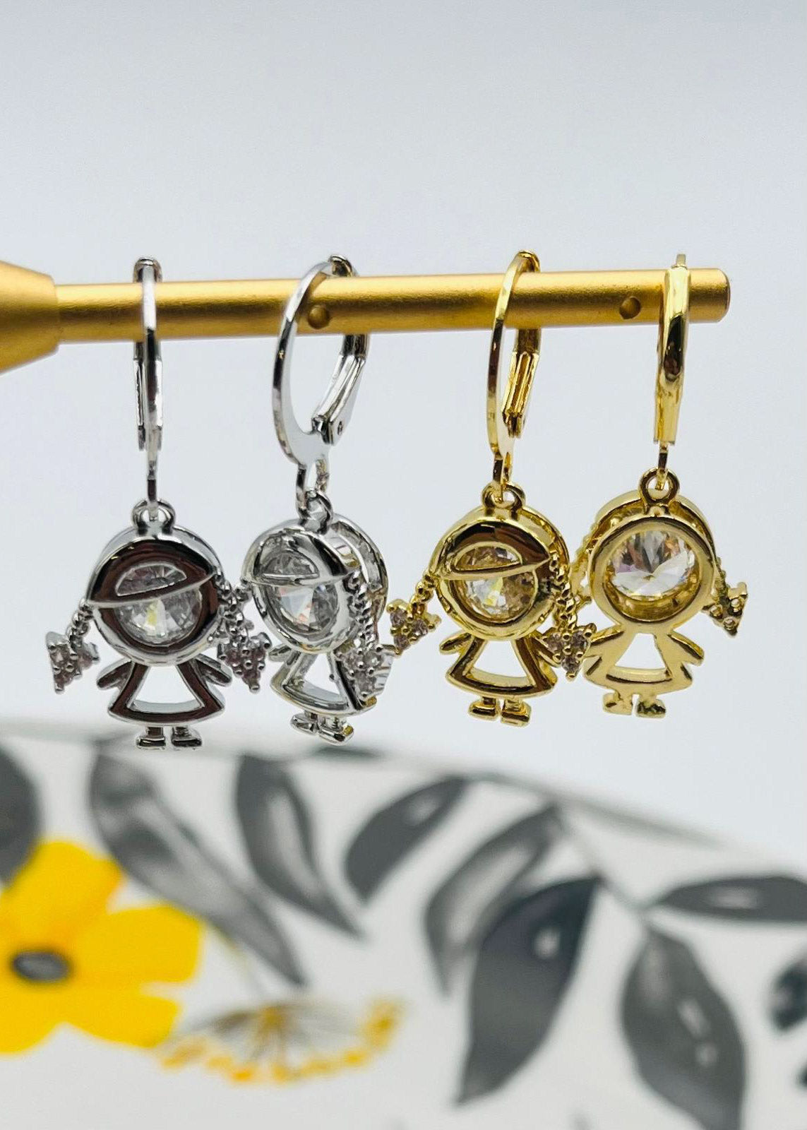 Los aretes en la imagen son pendientes tipo gancho o argolla con un dije en forma de figura, específicamente de una niña, con una piedra central de circonita o similar.