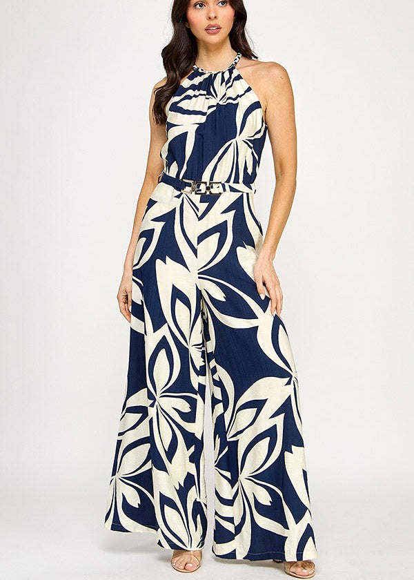BRAID TRIM HALTER NECK BELTED JUMPSUIT | Navy