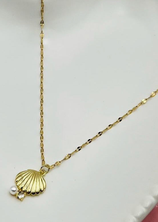 Este collar de almeja dorada en stainless steel es el accesorio perfecto para agregar elegancia y estilo a cualquier atuendo. Su diseño de almeja añade un toque de belleza natural, mientras que el stainless steel asegura durabilidad y resistencia. Haz una declaración de moda con este collar único y refinado.