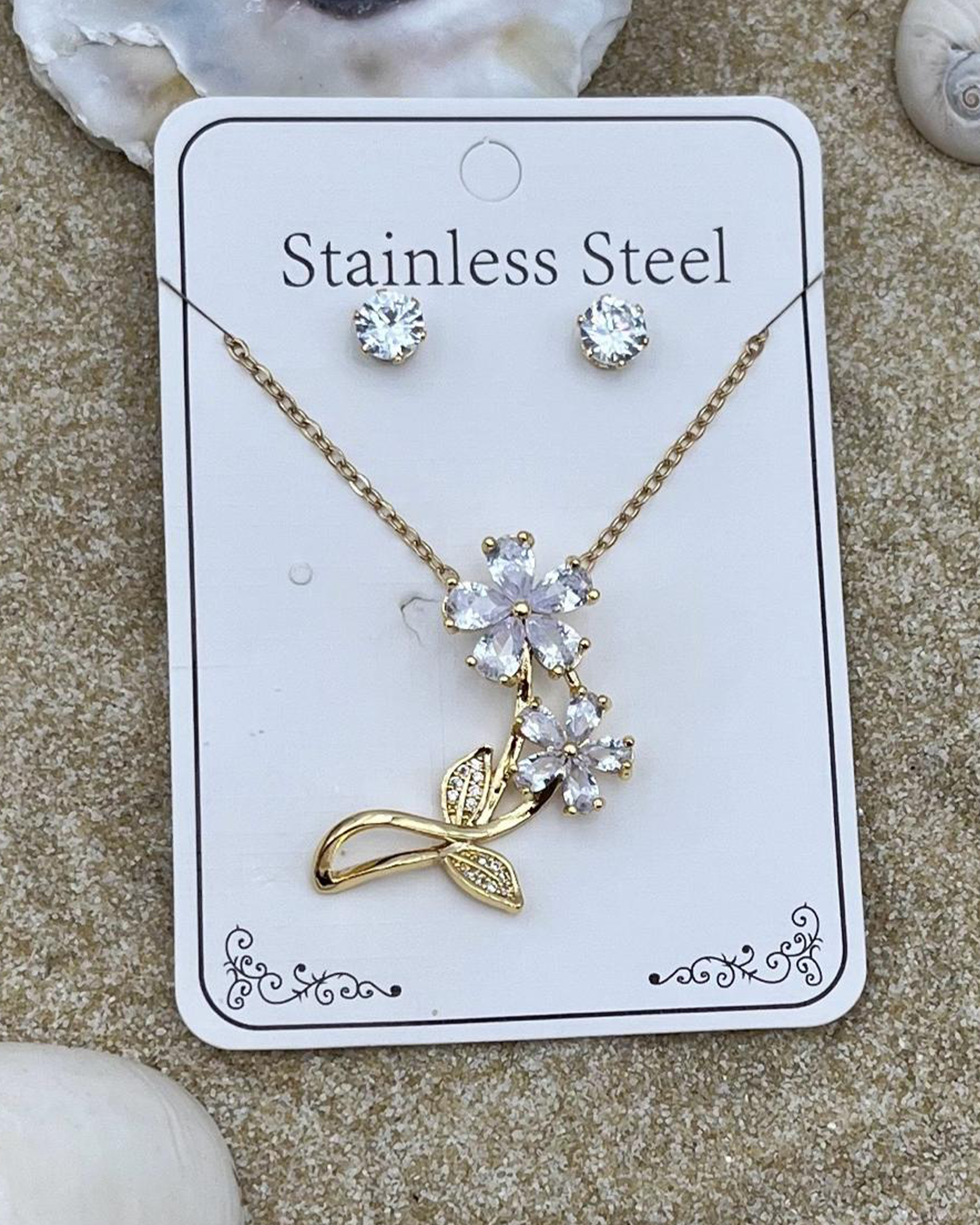 Collar en Stainless Steel con charm de hoja y petalos de rhinestone