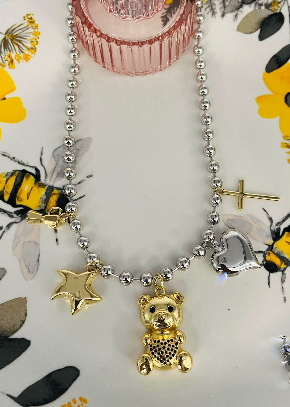 "Este elegante collar con variados dijes como osito, cruz y corazón, está hecho de oro plateado y es perfecto para agregar un toque de dulzura y protección a tu estilo. Muestra tu lado tierno y religioso con este collar versátil."