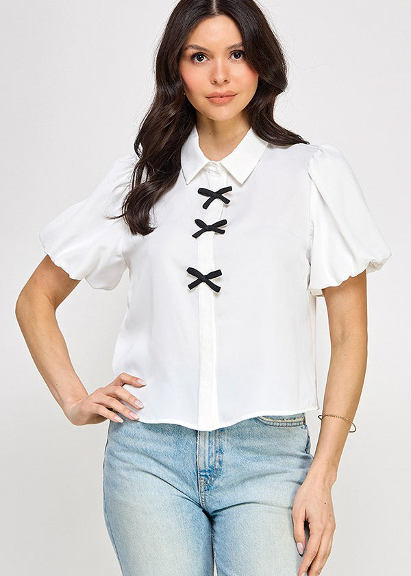 COLOR CONTRAST BOW DETAIL SSLV TOP | WHITE