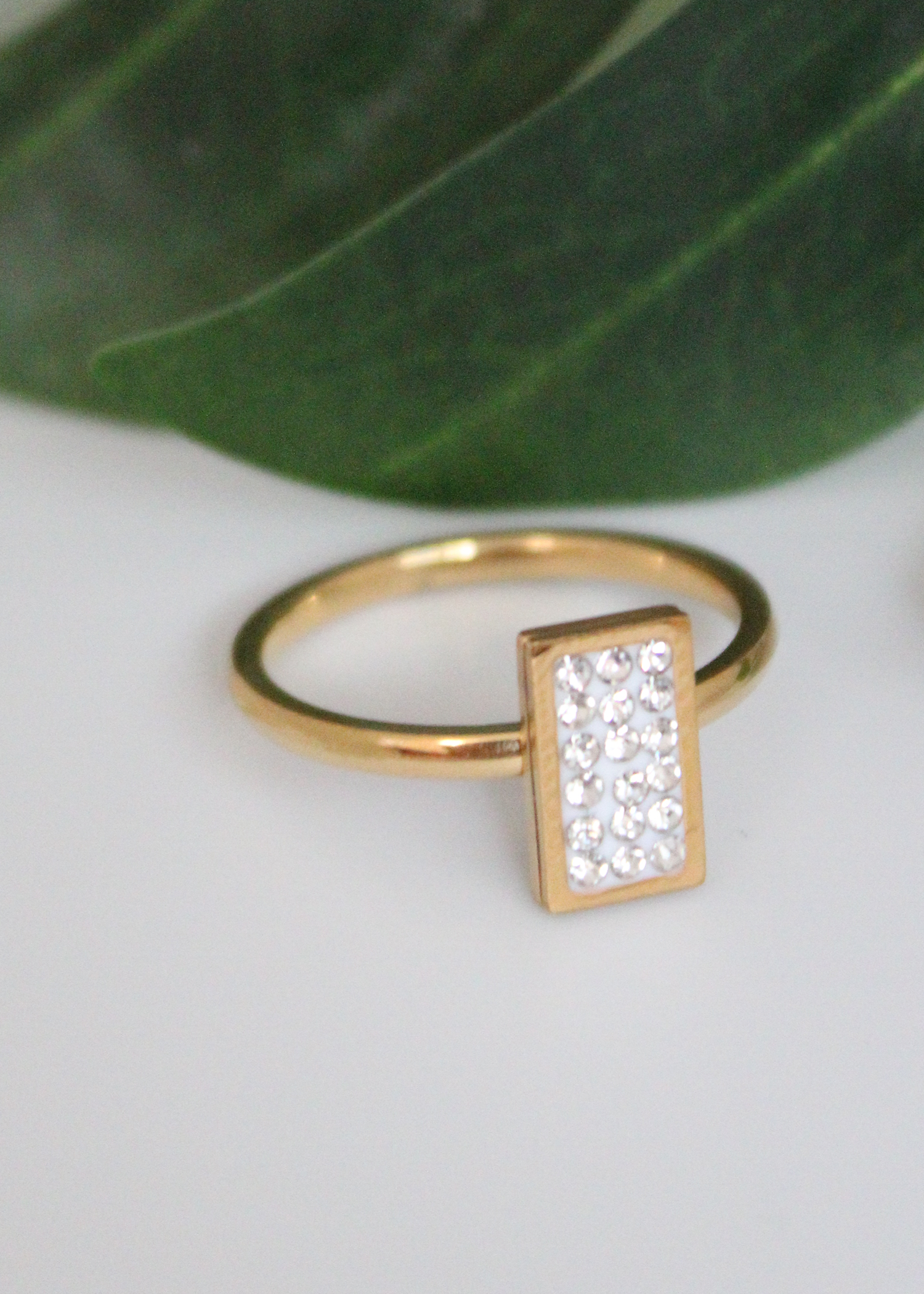 This stylish stainless steel rectangular ring features shimmering rhinestones, providing a contemporary touch of sparkle. Crafted with quality in mind, it is sure to make a statement.