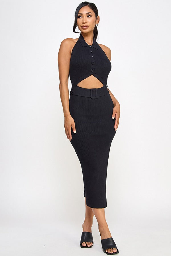 CUT OUT SWEATER MIDI DRESS W/ SLIT