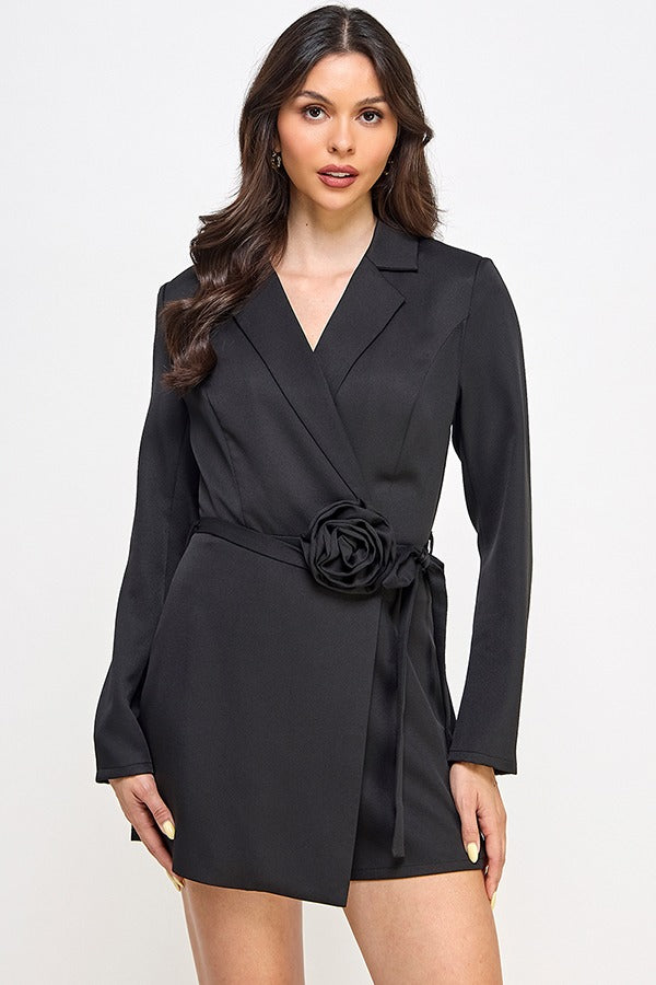 LSLV BLAZER ROMPER W/ FLOWER CORSAGE WAIST TIE | BLACK