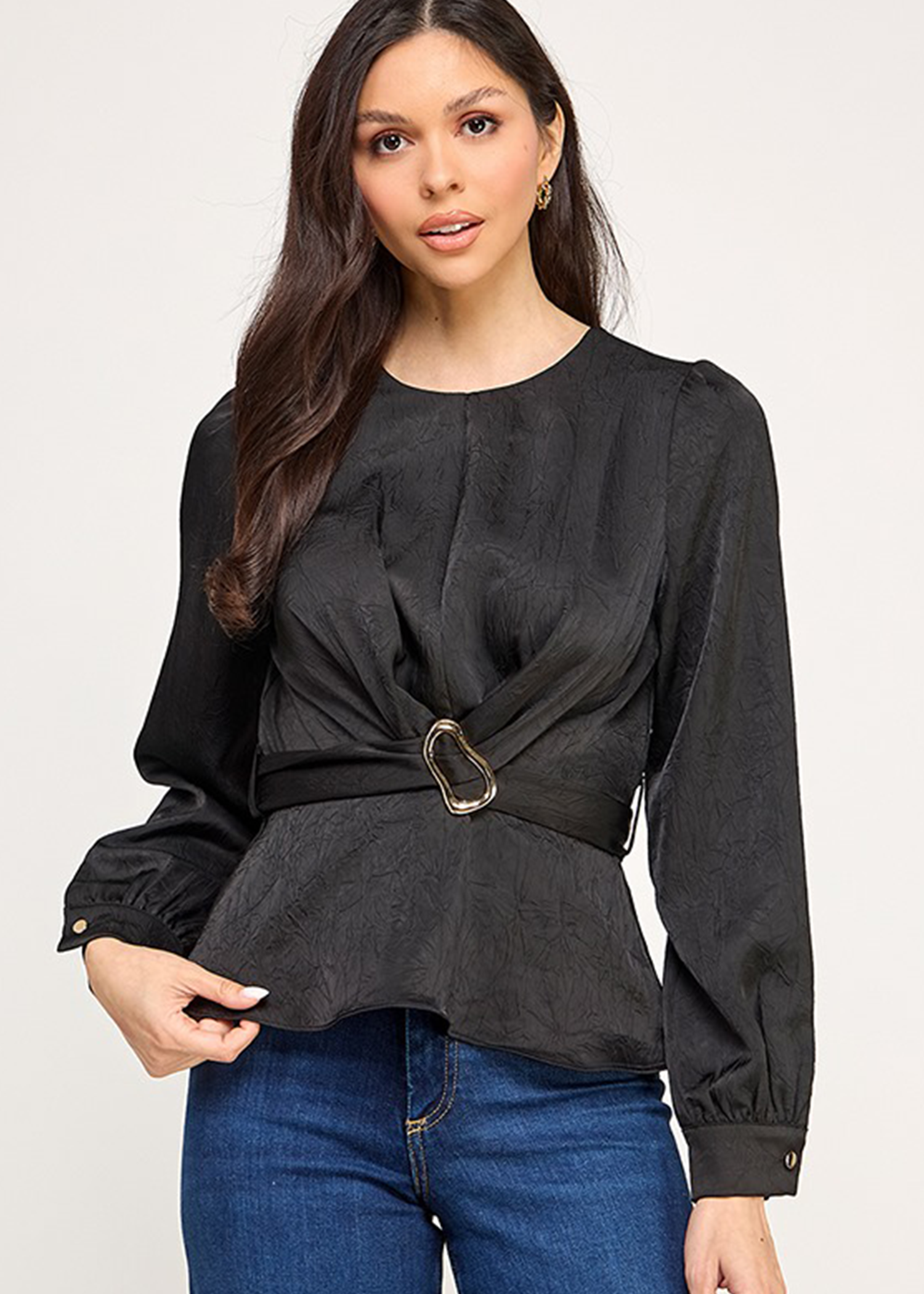 LSLV PEPLUM TWIST FRONT TOP W/ WAIST BUCKLE TRIM