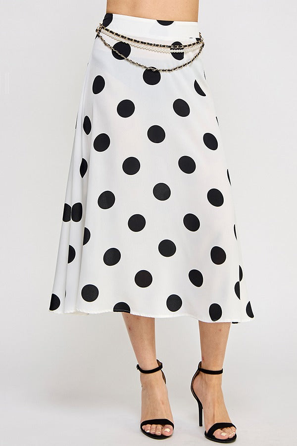 POLKA DOT PRINT PLEATED MIDI SKIRT W/BELT