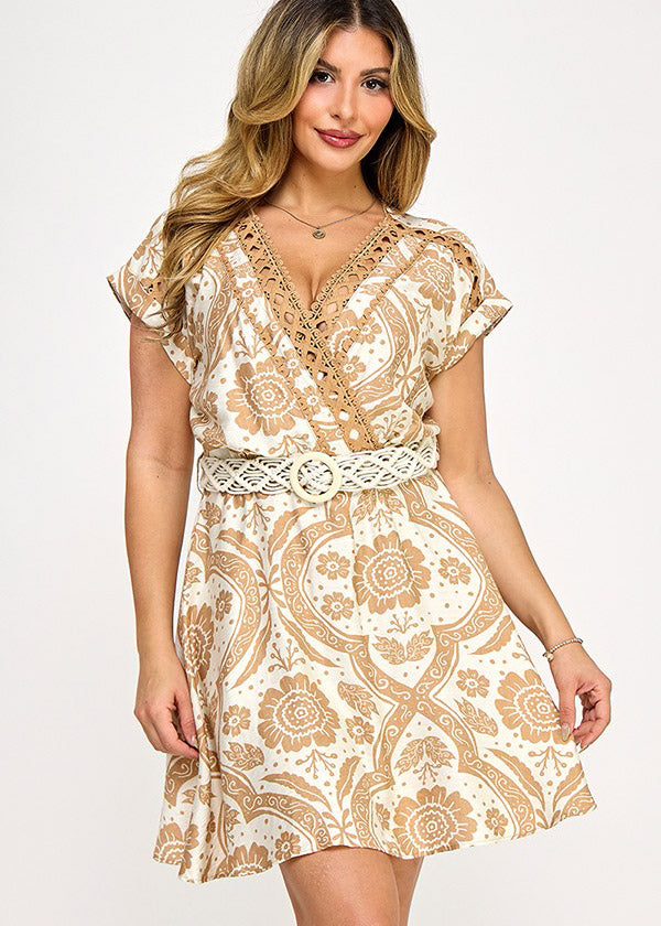 PRINTED SURPLICE MINI DRESS W/ LACE TAPE & TRIM BELT