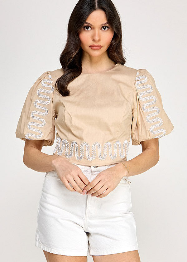 PUFF BUBBLE SLV TOP W/ EMBROIDERY DETAIL