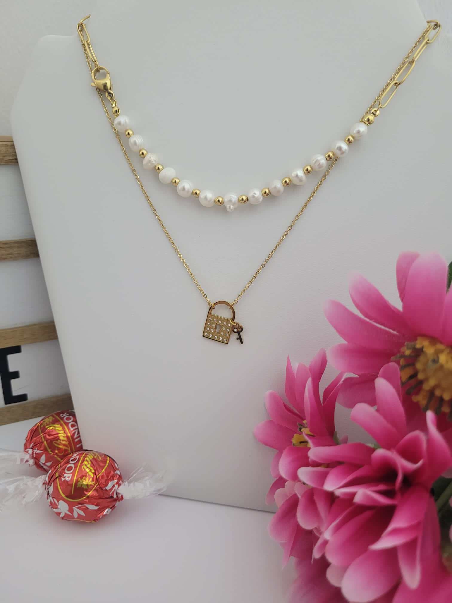 Este hermoso collar de acero inoxidable es la combinación perfecta de elegancia y durabilidad. Hecho de acero inoxidable de alta calidad, este set de collar es resistente por tal razon es una prenda que te durara, y es fácil de limpiar y mantener. Con un diseño moderno y elegante, de dos cadenas, con diseños de candado con rhinestone y la mezcla de perlas blancas. Es perfecto para cualquier ocasión. El tamaño es ajustable para un ajuste cómodo.