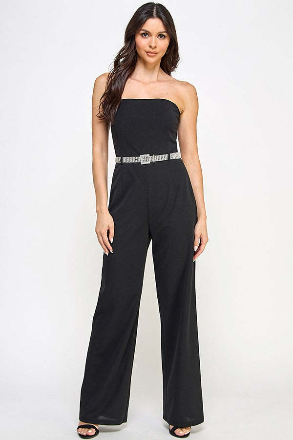 STRAPLESS JUMPSUIT W/ RHINE STONE BELT | Color Black