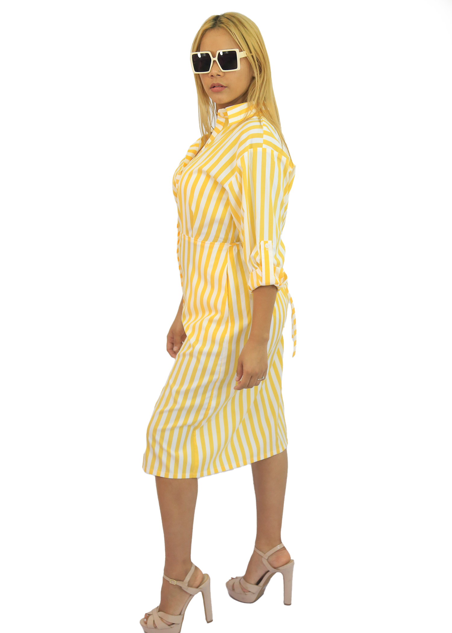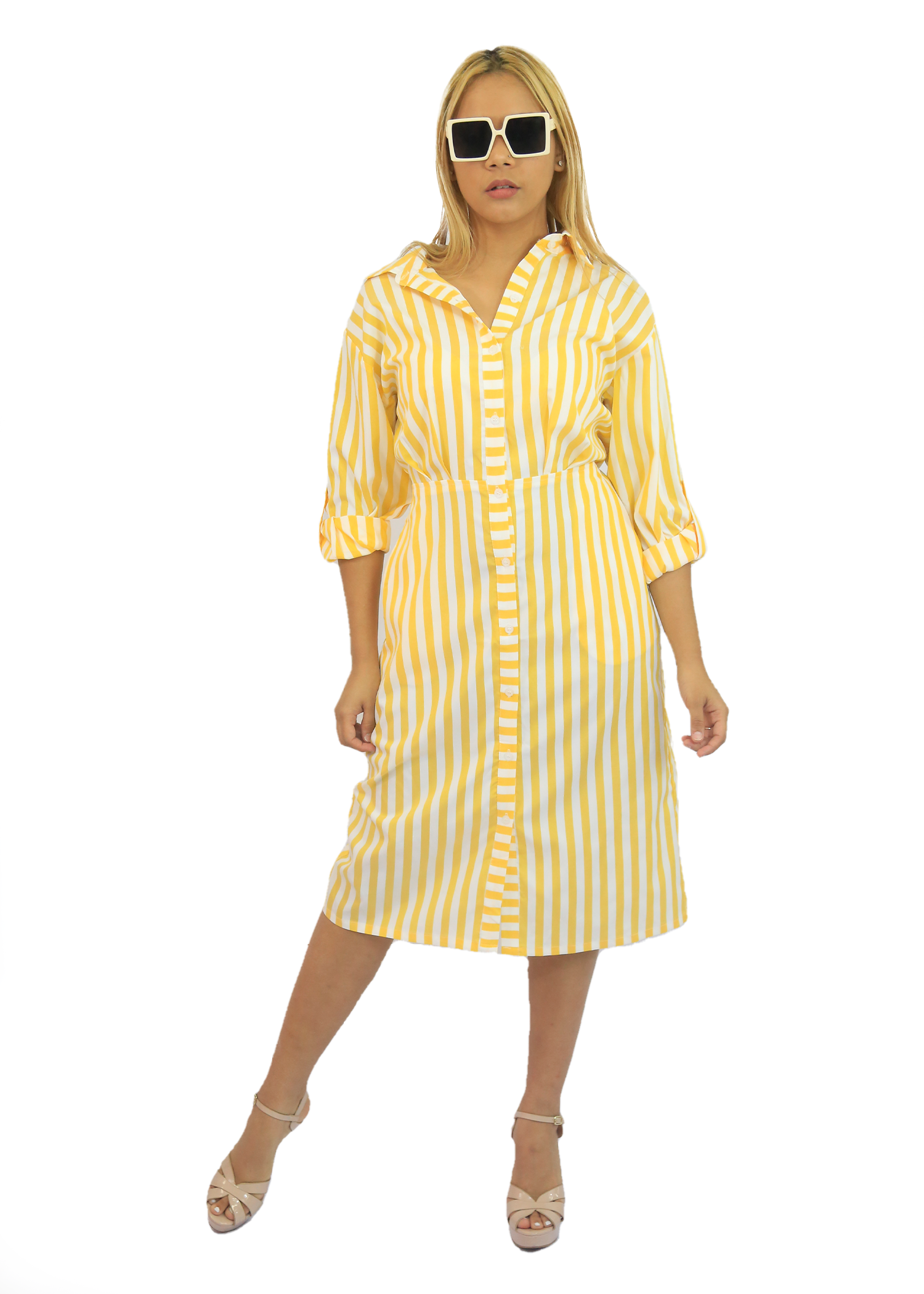 Este vestido maxi, ofrece un look impecable con su tono amarillo, diseño abotonado y estampado clásico de rallas hacia abajo. Diseñada para favorecer la figura, esta pieza mejorará cualquier atuendo con un toque atemporal y elegante.