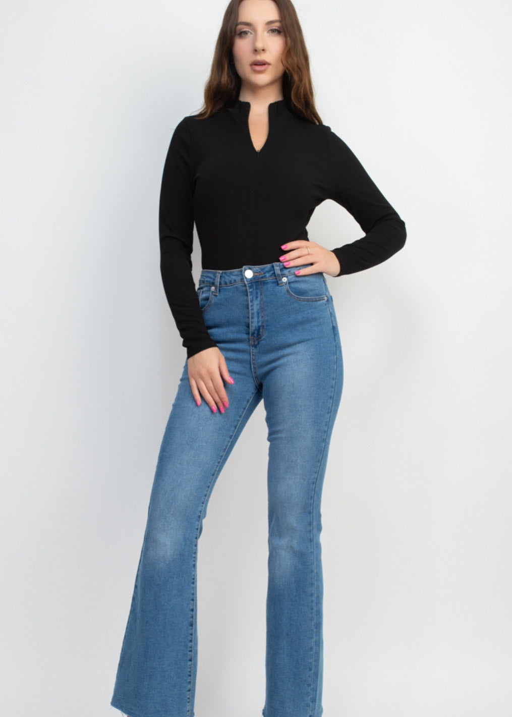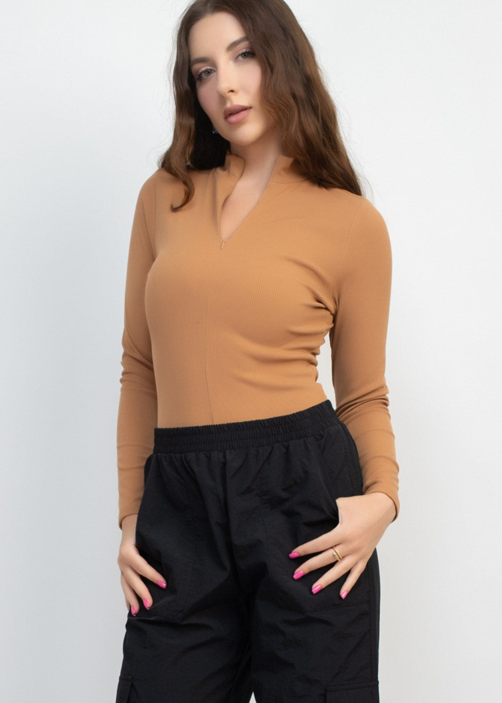 A ribbed-knit retro fashion bodysuit top in solid color featuring a mock neckline, zip-up front, long sleeves, fitted, and a snap button closure
